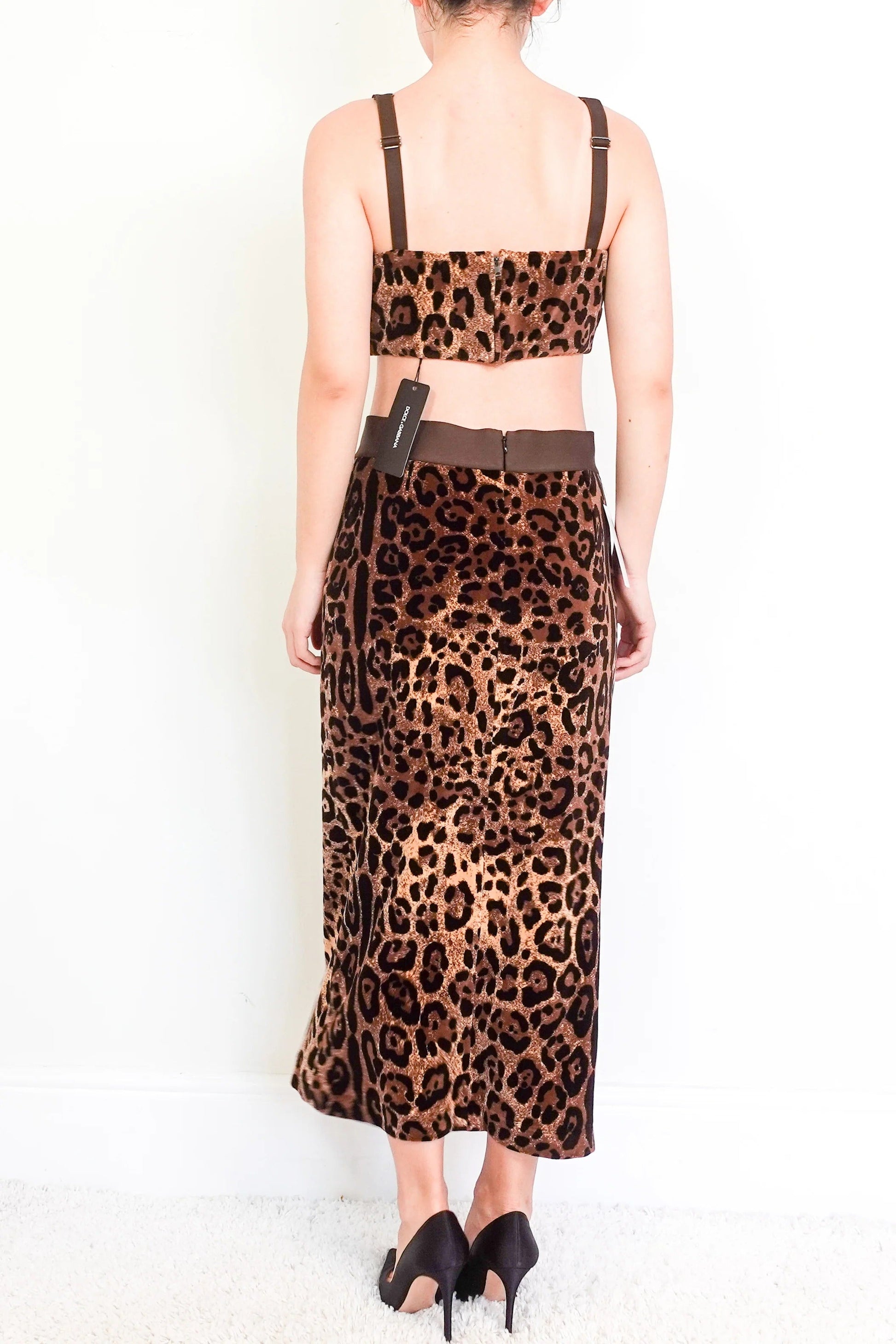 NEW Gorgeous leopard print 2 piece co-ord set. Made from a plush cotton-blend chenille fabric, this midi skirt has stretch whilst maintaining a fitted pencil skirt silhouette, enhancing curves. The iconic leopard print is complimented by a brown logo waistband. The skirt is paired with a cropped top in the same jacquard material and finished with a rear zipper and hook-and-eye fastening.